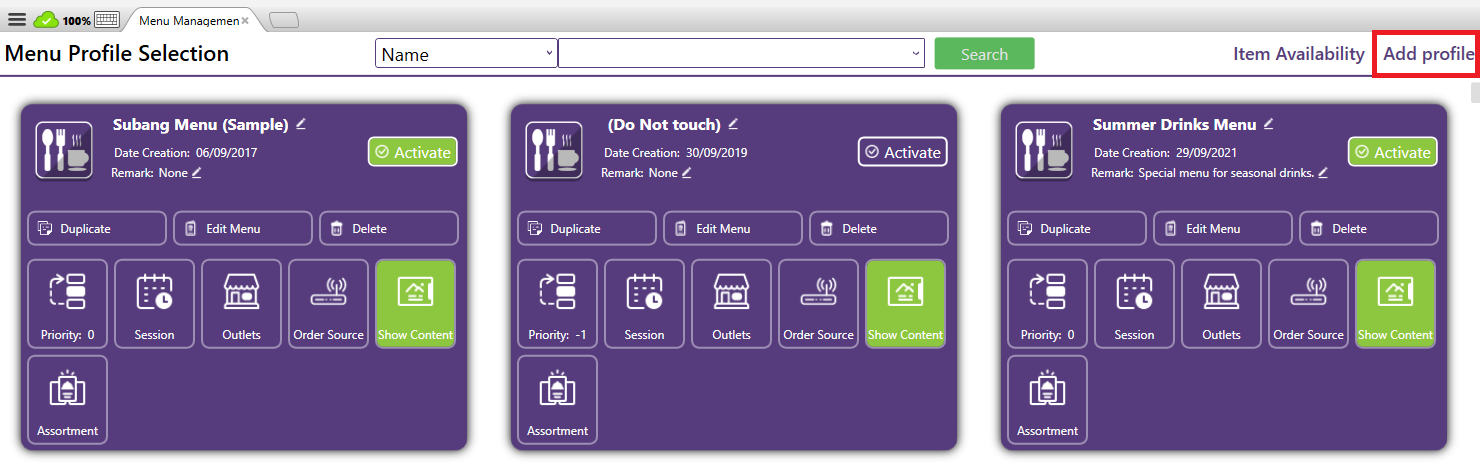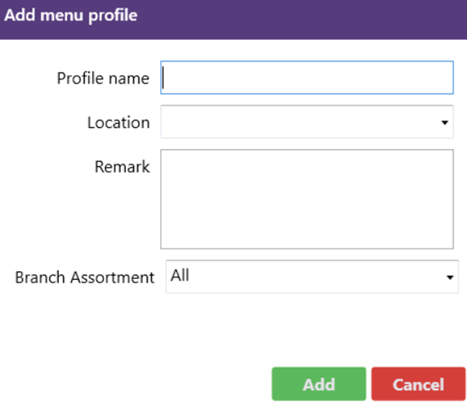 The Edit Menu Profile function allows you to modify the existing settings, items, or configurations within a specific menu profile. It’s used when you need to update what items are available, or change the profile’s details Add: Add menu item by ...