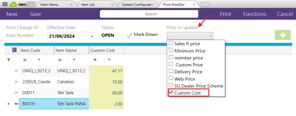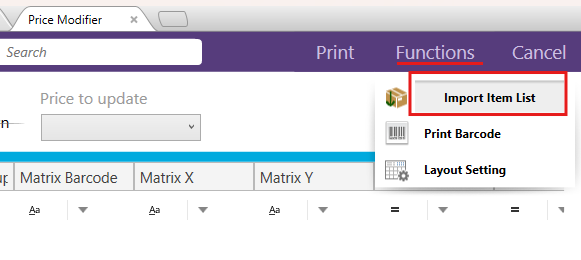 6. Go to Price Modifier, click on Functions and choose import Item List
