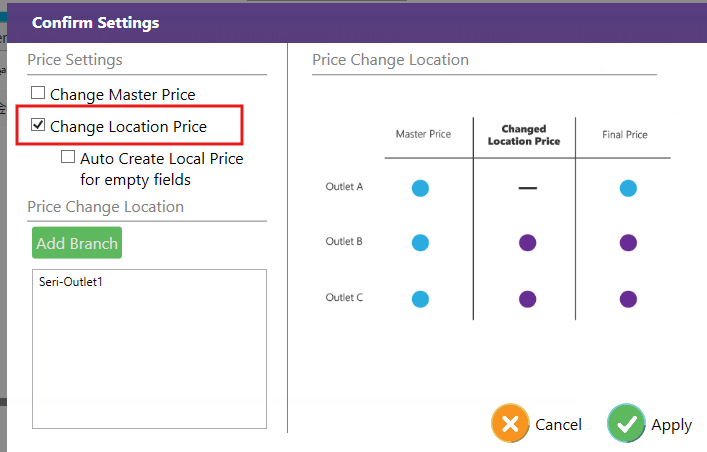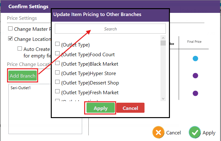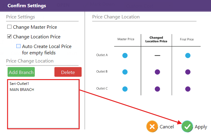 10. Add Branch to which branch that you need to update the custom cost and click Apply. The selected branch will be shown on the Confirm Settings screen.