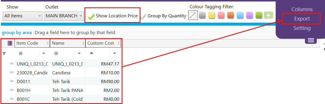 1. Get the item list from the location with custom cost (Item Code, Name, Custom Cost)