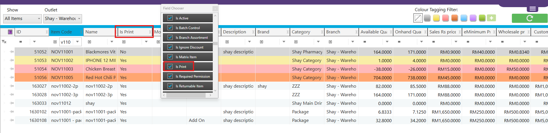 a. You may go to Item List > Drag Field Name: Is Print > Filter it by No.