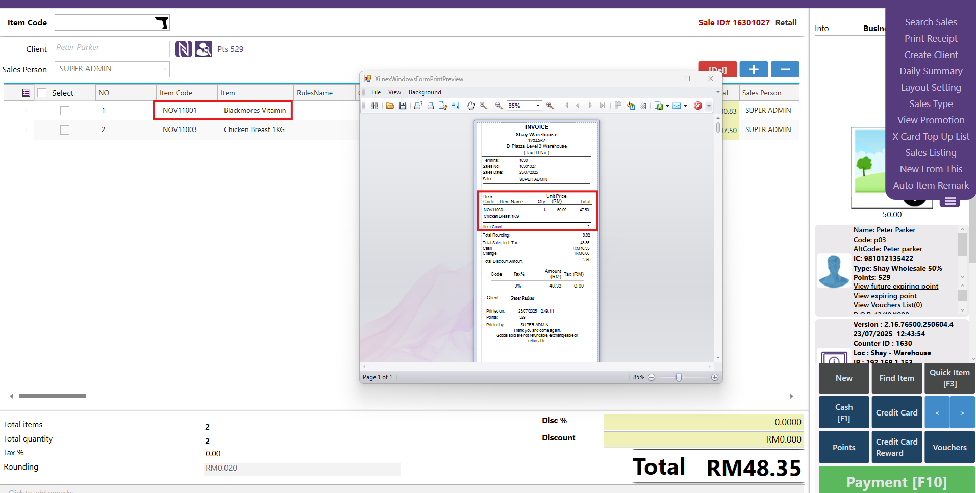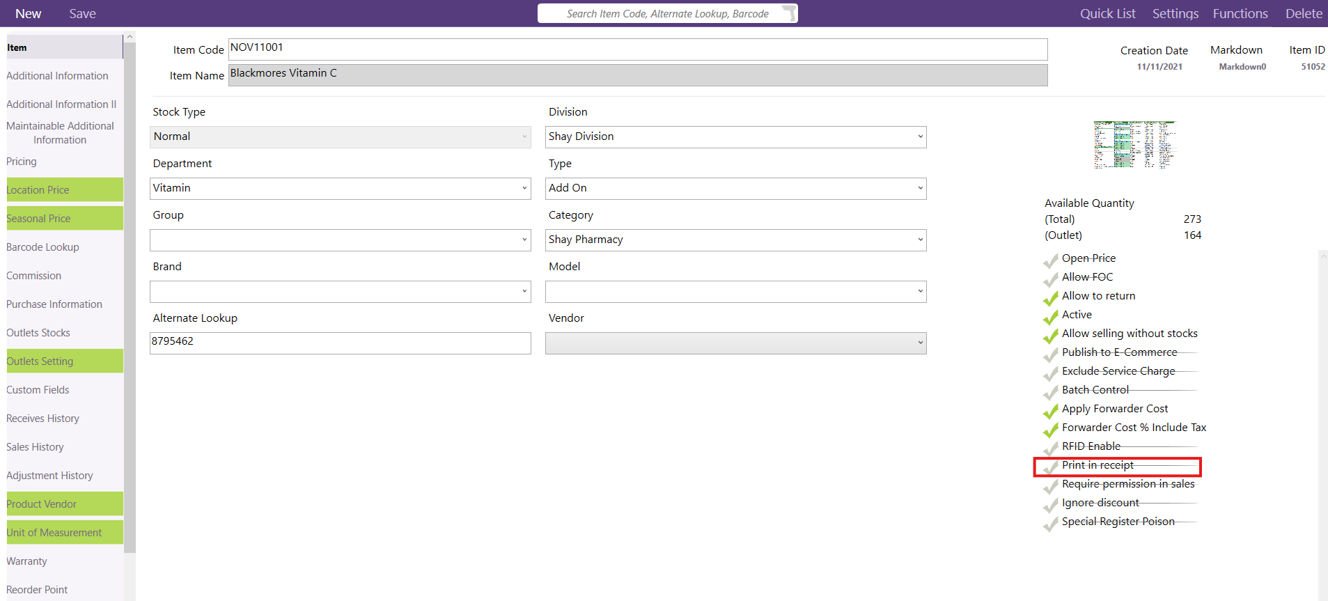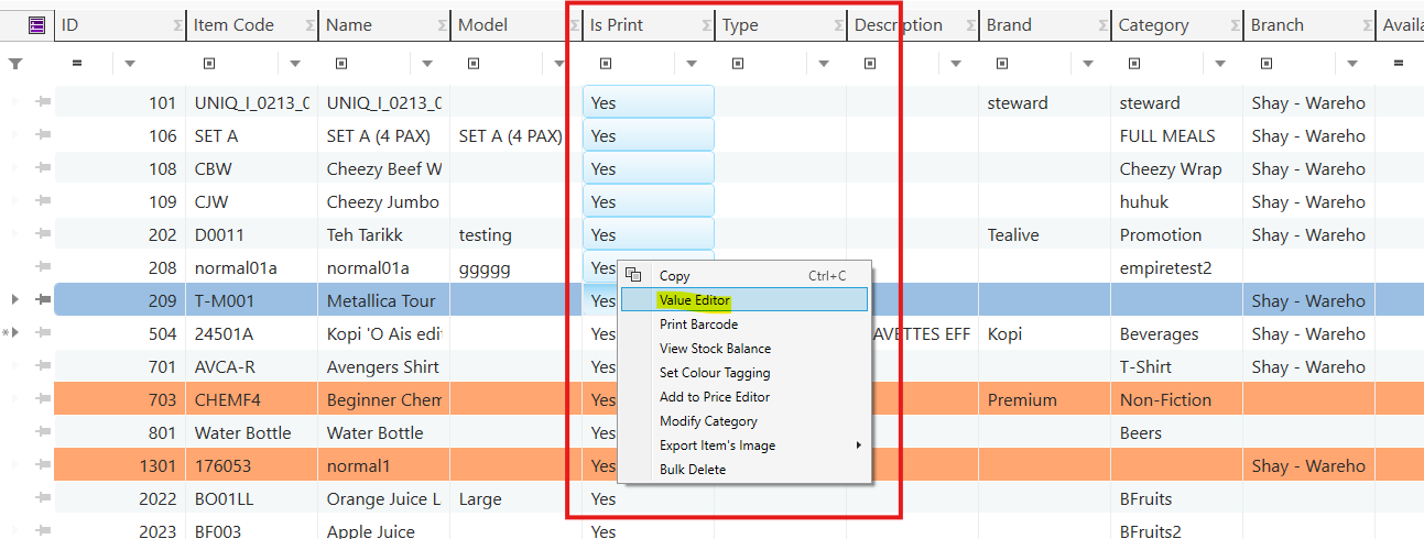 1.2.2 How to enabled setting Print in Receipt via Value Editor in Item List