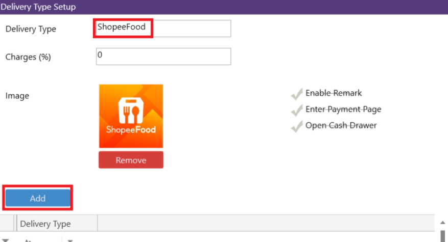 4. Click [Add] to add the delivery type and close the form.
