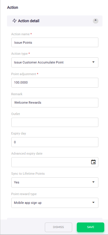 - Expiry day and Advanced Expiry Date can leave it blank, if you would like to provide non-expiry points rewards. Else you can input the points validity after users receive the points