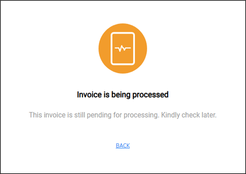 If the transaction has been claimed and submitted successfully, but is still pending IRBM processing, the portal will show “Invoice is being processed”. You may return later to check the status, or select Back to return to the main page.