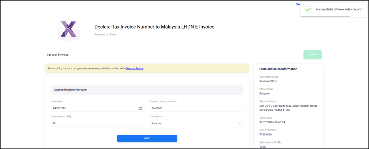 If all information matches, a confirmation message (e.g., “Successfully retrieves sales”) will appear, and the transaction details will be populated under Store and sales information.