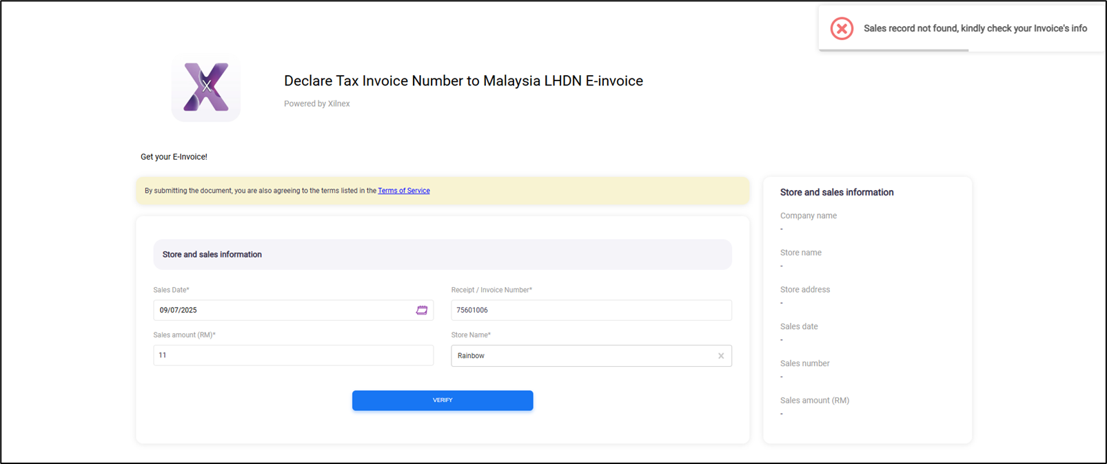 If any field does not match, the portal will show “Sales record not found”. Recheck the sales date, amount, receipt number, and store name, then try again.