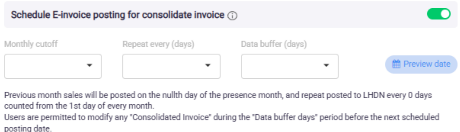 Monthly Cut Off | Day when the Consolidated E-Invoice is automatically generated and posted. This refers to the designated date on which the system finalizes and submits all sales data from the previous month to LHDN Malaysia.