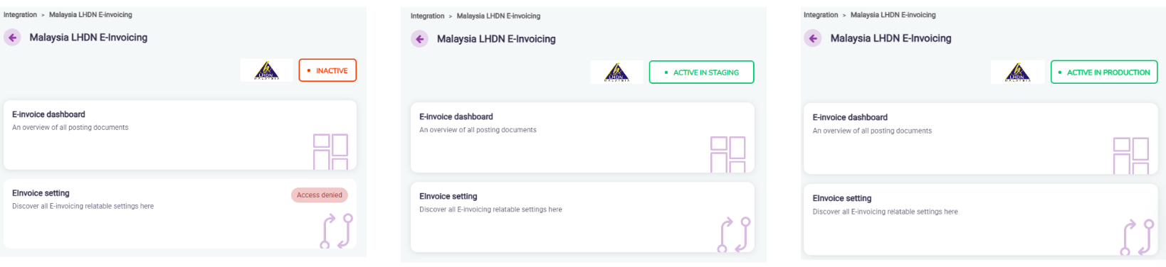 The Malaysia e-invoicing page can be found under Integration. If the e-invoicing module is not enabled, the button will appear in red with an INACTIVE status. Clicking the button will activate the e-invoicing module and set the environment to ACTIVE IN STAGING. Clicking it again will switch the environment to ACTIVE IN PRODUCTION.