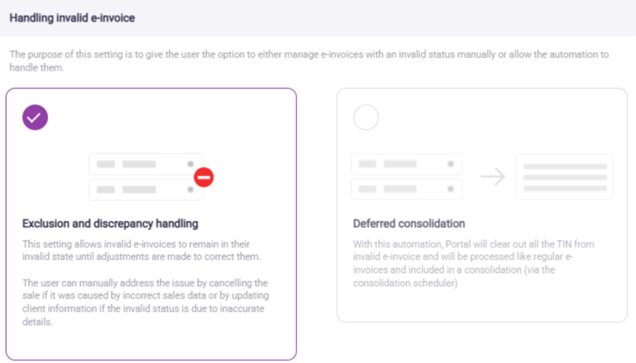 The purpose of this setting is to give the user the option to either manage e-invoices with an invalid status manually or allow automation to handle them.