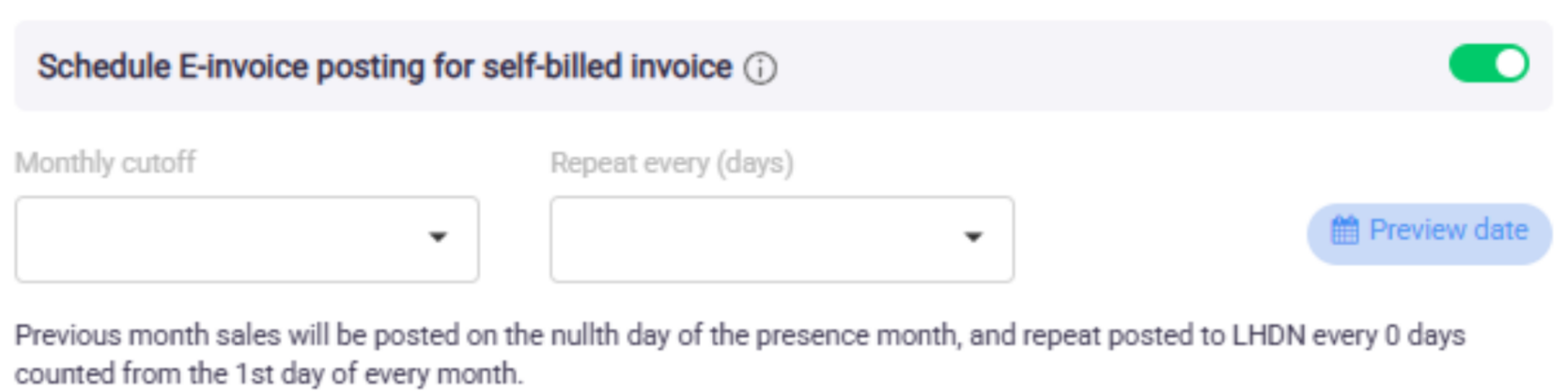 | On/Off Toggle | Use this option to enable or disable the Self-Billed E-Invoice posting schedule. | Enable |