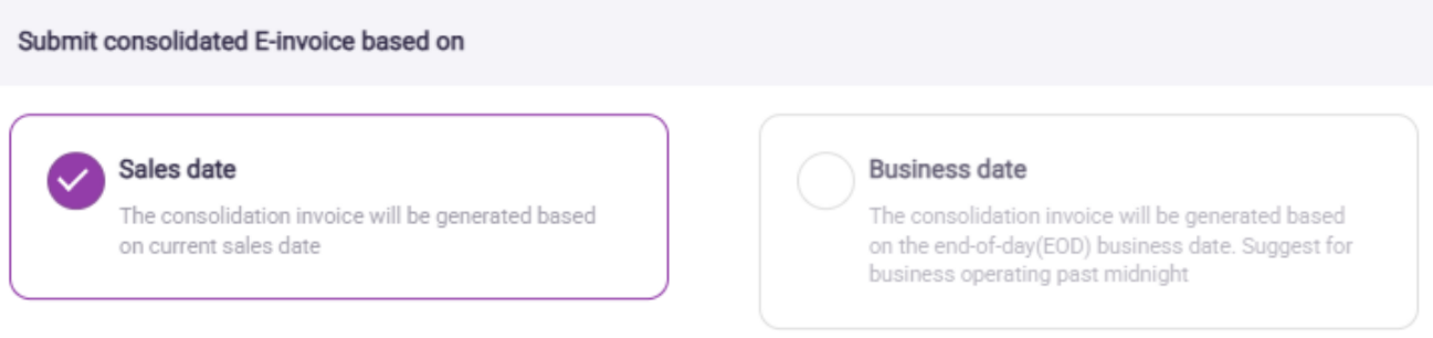 This setting allows users to submit their Consolidated E-Invoice based on their preferred date setting — either Sales Date or Business Date — depending on their business flow.