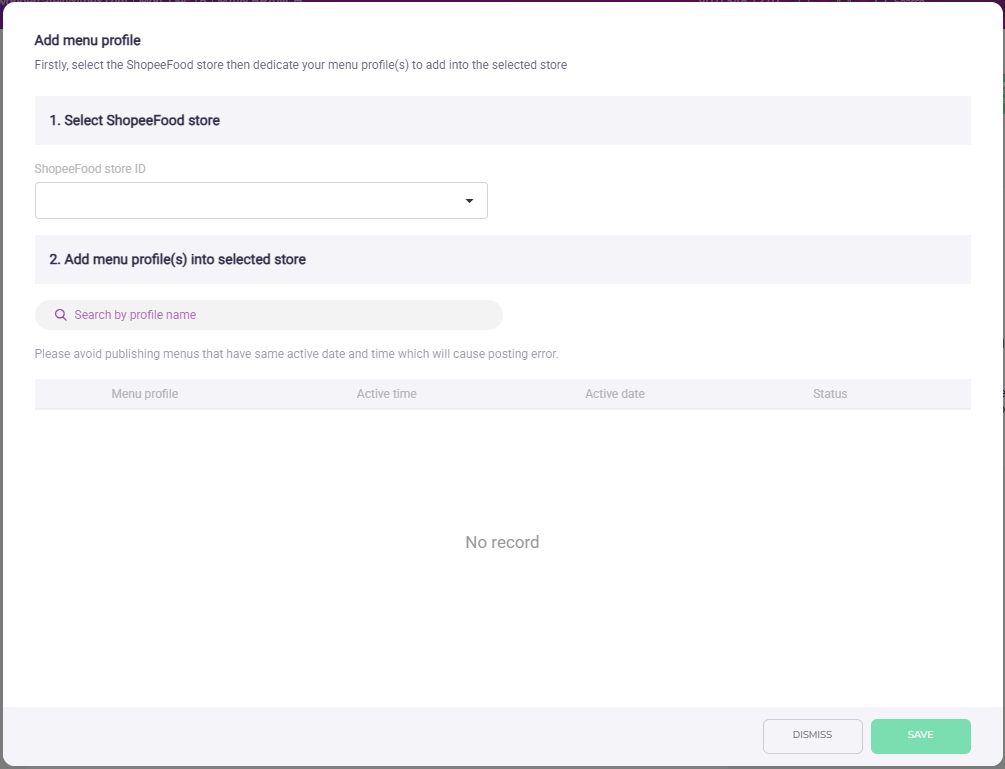 - Price scheme: Select the price scheme that the ShopeeFood sale type should refer to.
