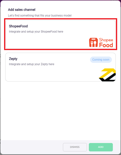 - Select either Grabfood, Foodpanda or Shopeefood, for this instance add 'ShoopeeFood'