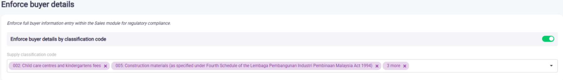 Location in X3 Portal: Integration >Malaysia LHDN E-Invoice > E-Invoice Settings > MaintainenceThis setting defines which Classification Codes require buyer details before submission. When enabled, the the system (such as Classic POS) performs a validation on each transaction: