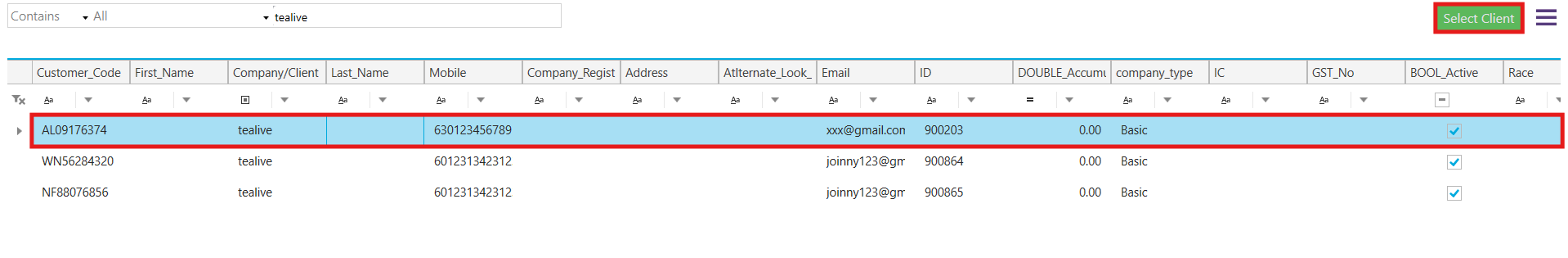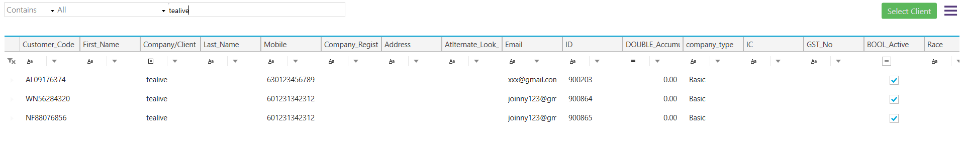 Search Field: All, Company/Client Full Name, Mobile Contact, Client Code, Registration Code, IC Number, or Alternate Lookup