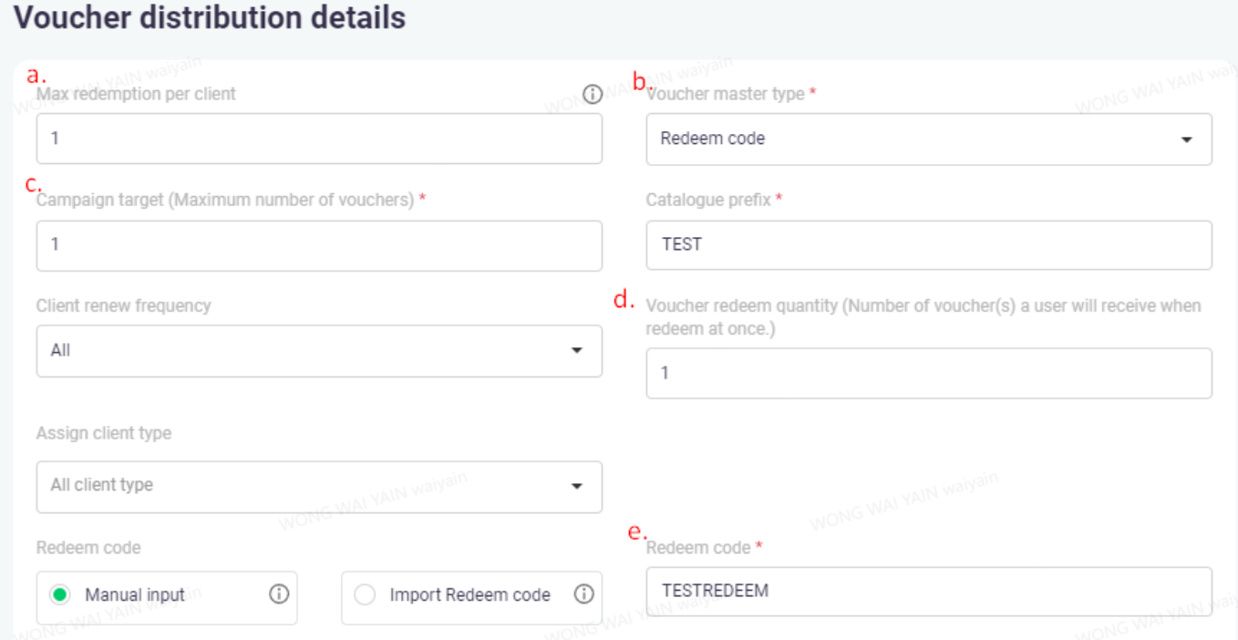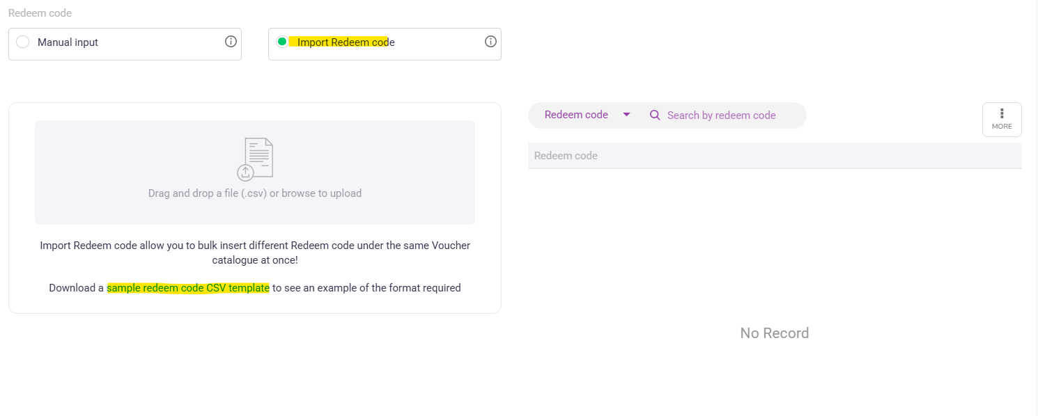 - Before import the list of unique codes, you can create the 1st redeem code voucher catalogue. Consider this as the test code.
