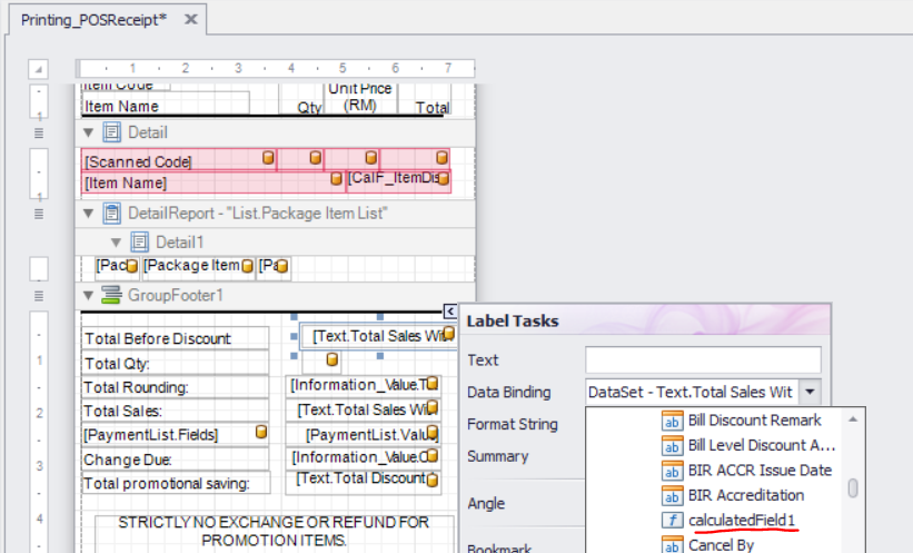 Calculated Fields are a custom field in the printing format editor that allows users to be able to customize fields to have certain values for example if user wants to be able to have a Subtotal of a sale to show with the discount amount of a sales.