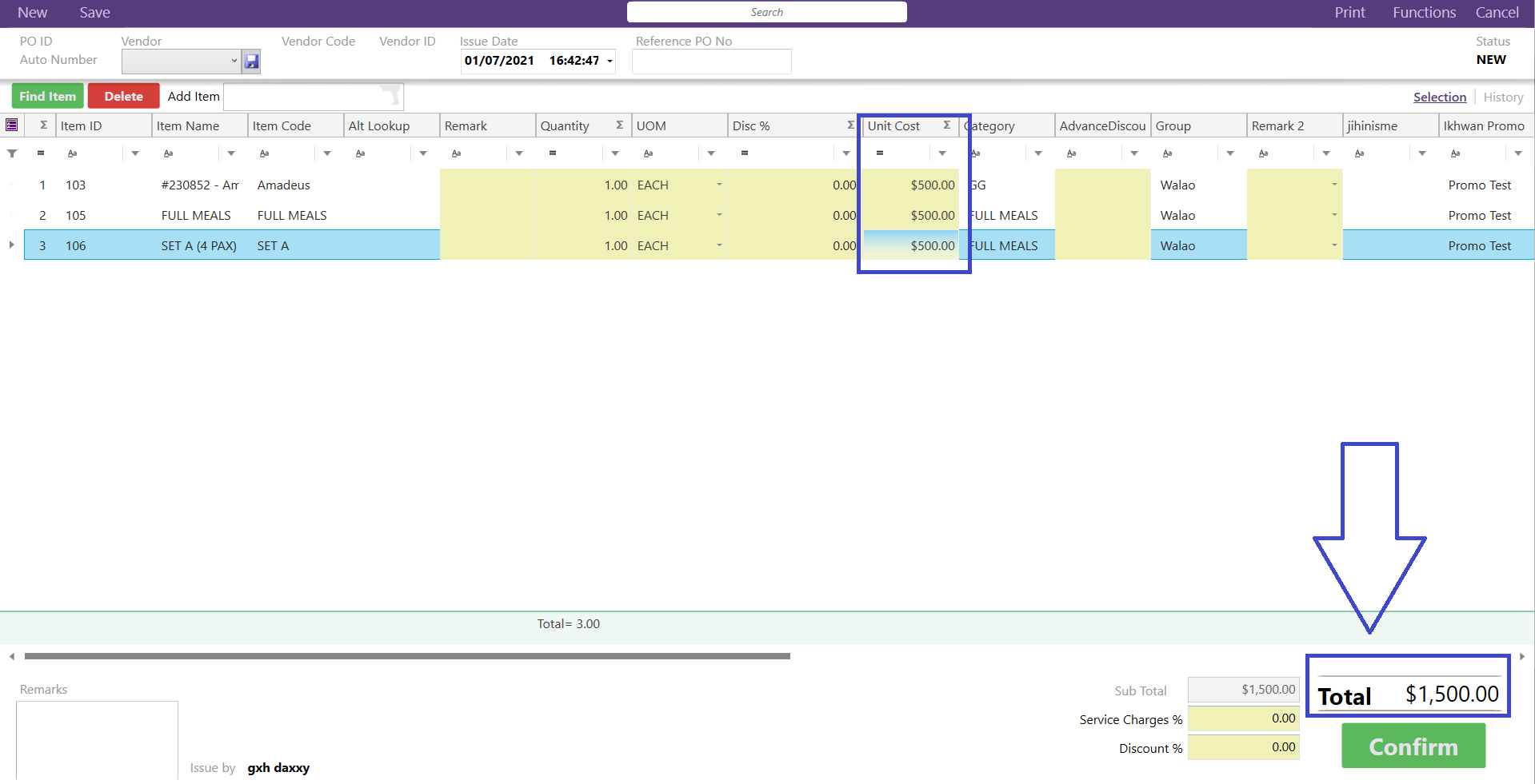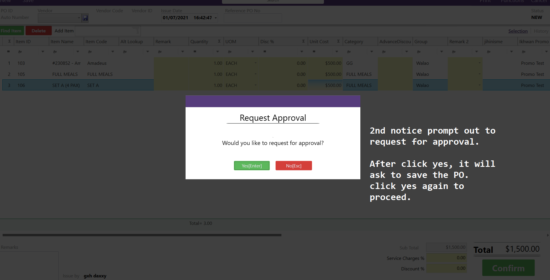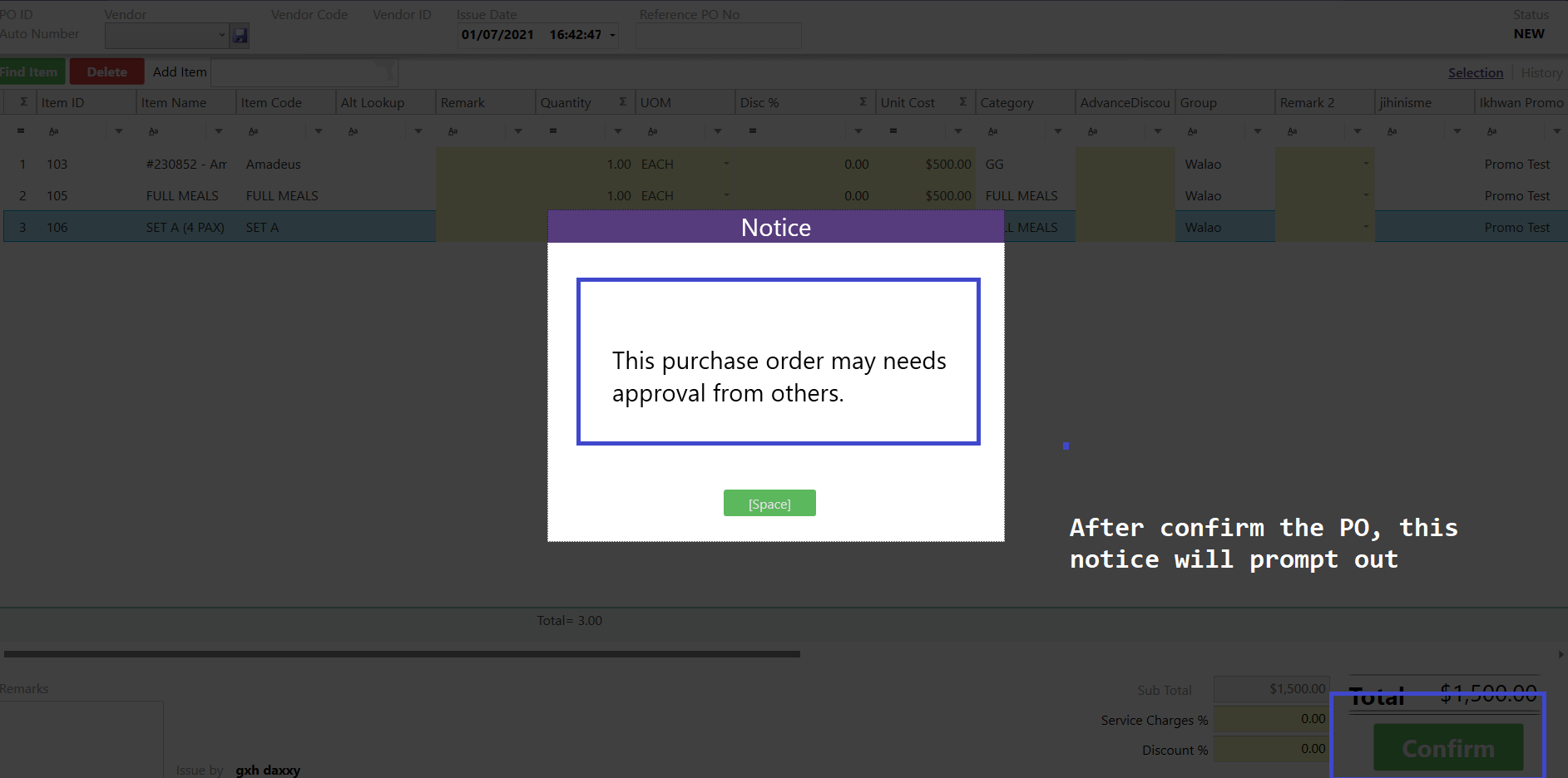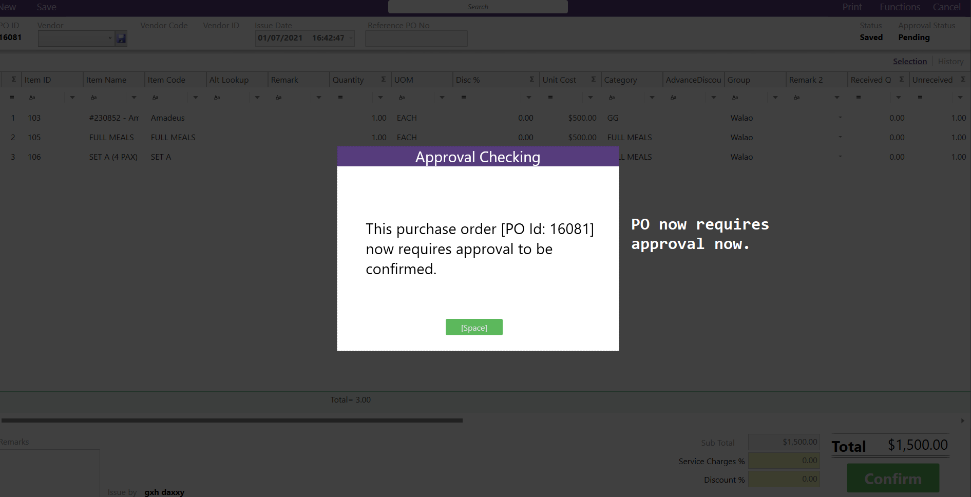 Once the PO is saved, the approval validation message will appear, indicating that the PO has entered the approval process based on the configured criteria. Click “Space”, again to proceed.