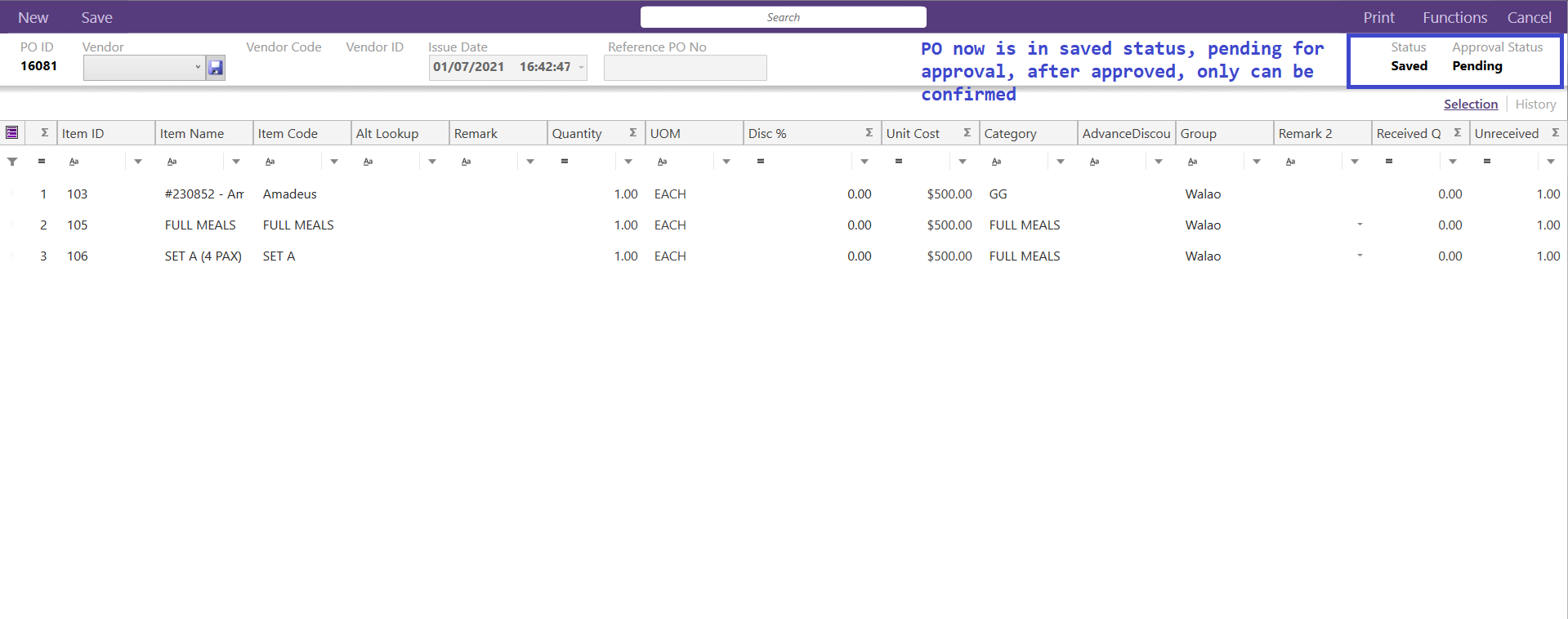 Next, your Purchase Order (PO) will be in Saved status, and the Approval Status will show as Pending.
