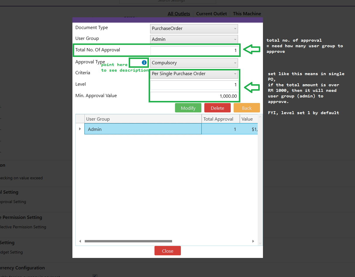 Here’s an example of an Approval Setting for a single Purchase Order (PO):