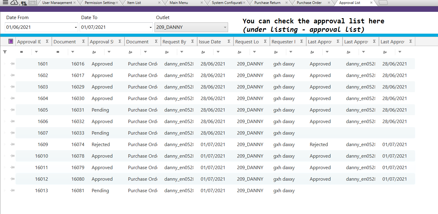 You can check the approval list by going to Approval Listing under the Approval List menu.