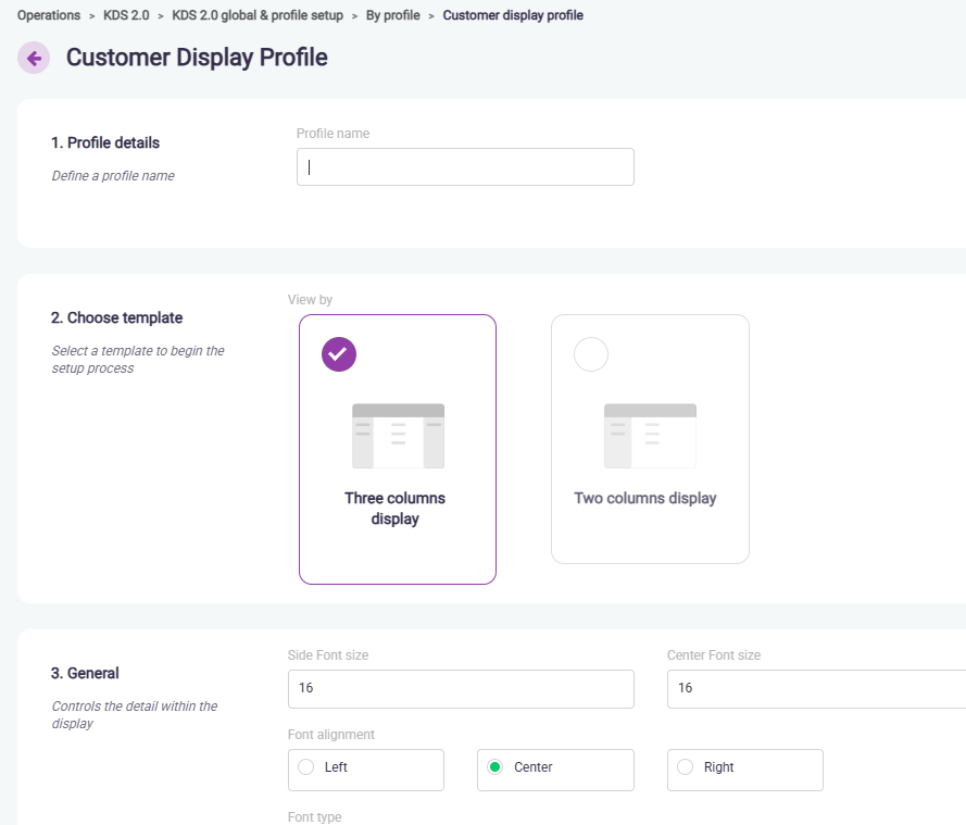 It's important to set a clear and descriptive profile name. This helps during KDS setup when assigning the correct profile to a specific device. (Example: Customer Display - Store A) - Choose template