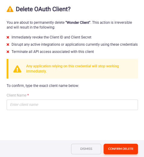 One-Time Secret Visibility - The Client Secret will be displayed only once upon creation. I understand it cannot be retrieved again after this screen is closed. If lost, a new secret must be regenerated, which may affect existing integrations.