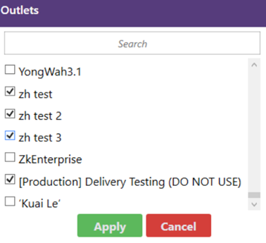 The Search feature makes it easy to find and select outlets, particularly when managing a large number of branches.