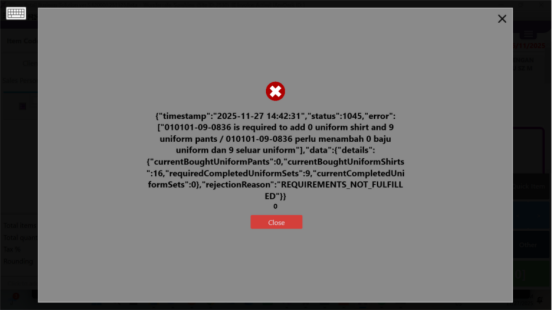 Payment Blocked: If customer does not fulfill the rule of purchasing rule (Uniform Shirt X Qty and Uniform Pants X Qty), and they try to purchase for other eligble items.