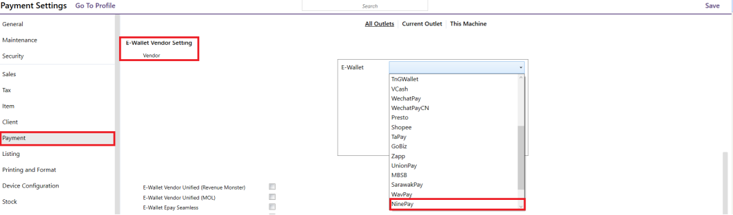 - In the All Outlet tab, go to E-Wallet Vendor Settings.