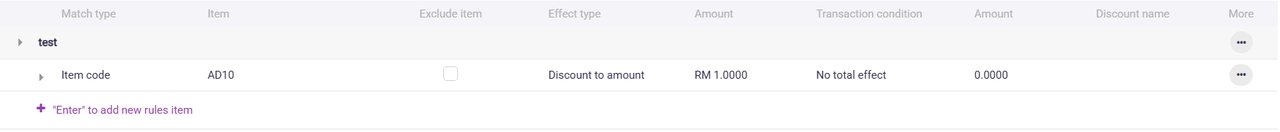 Discount to amount | Adjusts item price to a specific total amount. Notes: Similar to "Fixed Price" but will calculate discount percentage. | Price discount to RM15 regardless of original price |