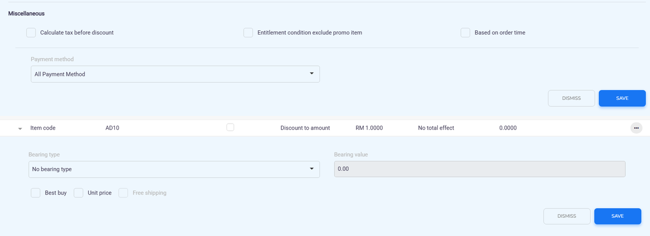 Discount by amount (Allow overlap other discounts) | Deducts a fixed amount from price and can stack with other discounts. Notes: Use for cumulative discount campaigns. | Additional RM5 off on member discounted price items. |