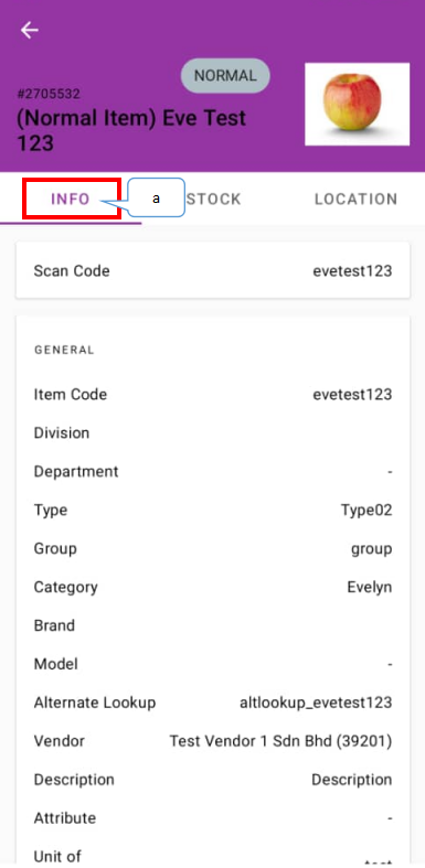 - Info: Provides details of the items such as item code, category, department, pricing, custom field values, and e-invoice info.