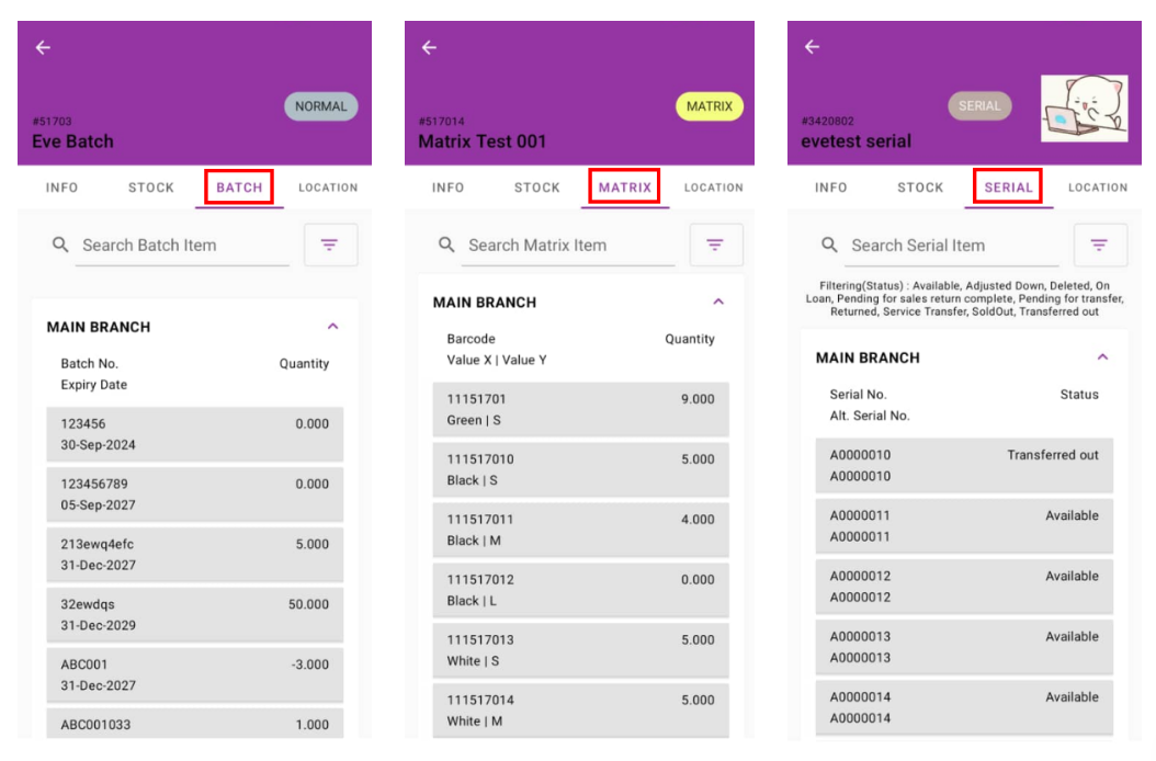 7. There is also another tab depending on the type of item searched. This tab displays the batch, matrix and serial number quantities for batch, matrix and serial stock types respectively, according to the allowed outlets of the current login user.