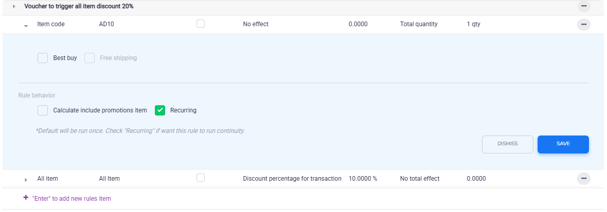 Use Case: New item promotion, upsell for specific item. From the sample above, there are 2 rows of items added into the rules item list. This means that the promotion will be triggered when any 2 items are added into the sales. With the promotion ...